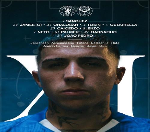 切尔西首发:1-桑切斯、24-里斯-詹姆斯、23-查洛巴、4-阿达拉比奥尤、5-库库雷利亚、25-凯塞多、8-恩佐、7-佩德罗-内托、10-帕尔默、49-加纳乔、20-若昂-佩德罗