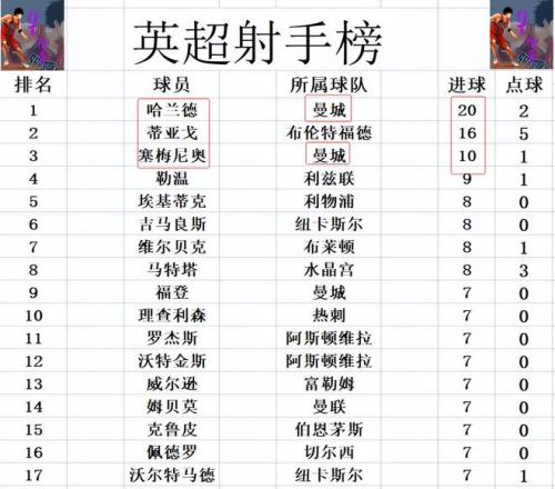 射手榜方面,哈兰德20球领跑,蒂亚戈16球位列第2,塞梅尼奥10球排在第3。勒温9球排第4,福登,理查利森,姆贝莫和沃特金斯等人7球刚好挤入前十。
