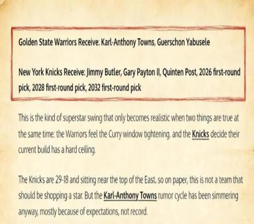 尼克斯摆脱唐斯,得到字母哥;勇士摆脱巴特勒,得到唐斯;而雄鹿吃下巴特勒的垃圾合同,从尼克斯和勇士手中同时拿到选秀权或年轻资产,让交易回报最大化。