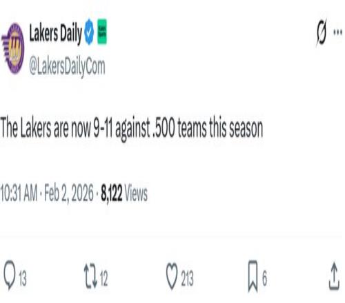 输给尼克斯之后,湖人本赛季对阵胜率超过50%的强队时,战绩跌至9胜11负,而对阵弱旅的战绩则为20胜8负。