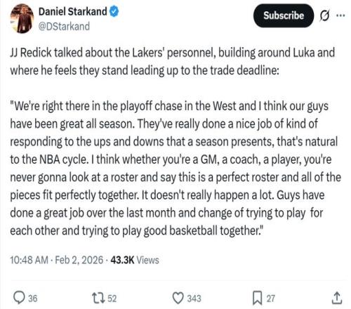 并且就目前的情况来看,湖人队大概率不会在截止日前有大手笔的操作,雷迪克赛后被问到相关问题时也给出类似答案。
